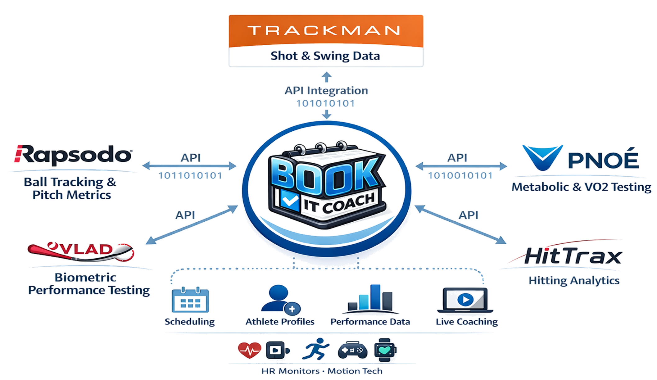 BookItCoach is designed to be interoperable with the performance technology shaping modern coaching. Our platform supports API integrations with leading sports data systems such as TrackMan, VLAD, RAPSODO, Hit Trax, PNOĒ, and other biometric analysis tools used to measure performance, conditioning, and recovery.
